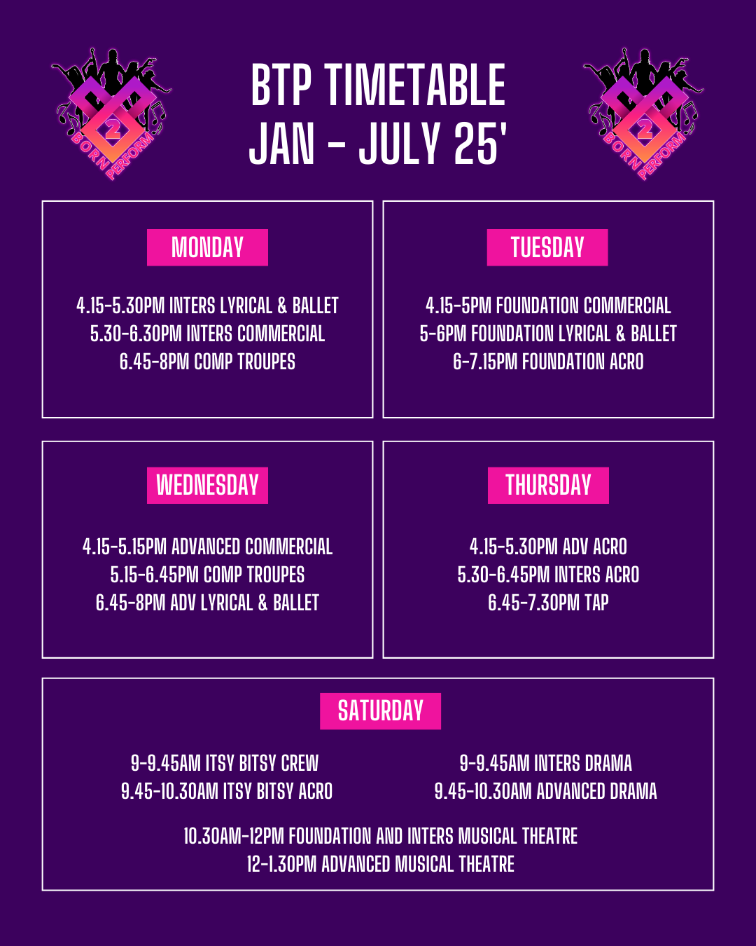 4.15pm to 5.30pm ~ Inters Lyrical & Ballet 5.30pm to 6.30pm ~ Inters Commercial 6.45pm to 8pm ~ COMP TROUPES